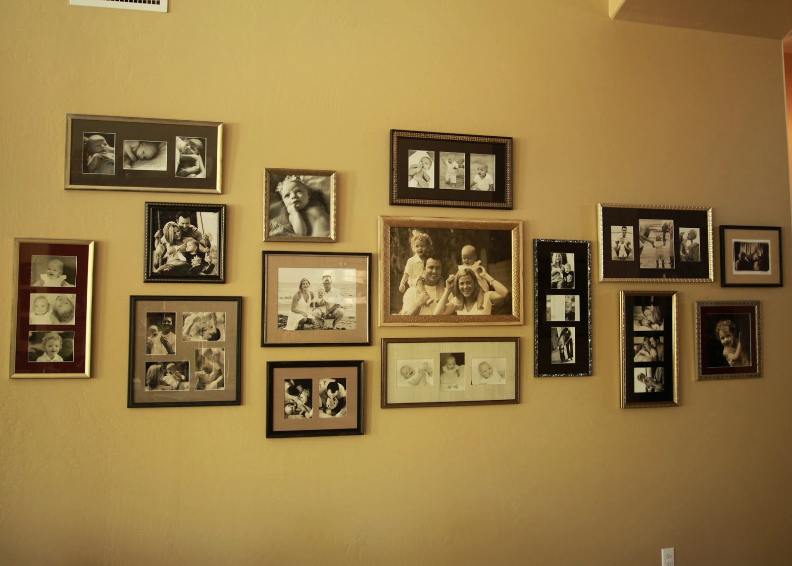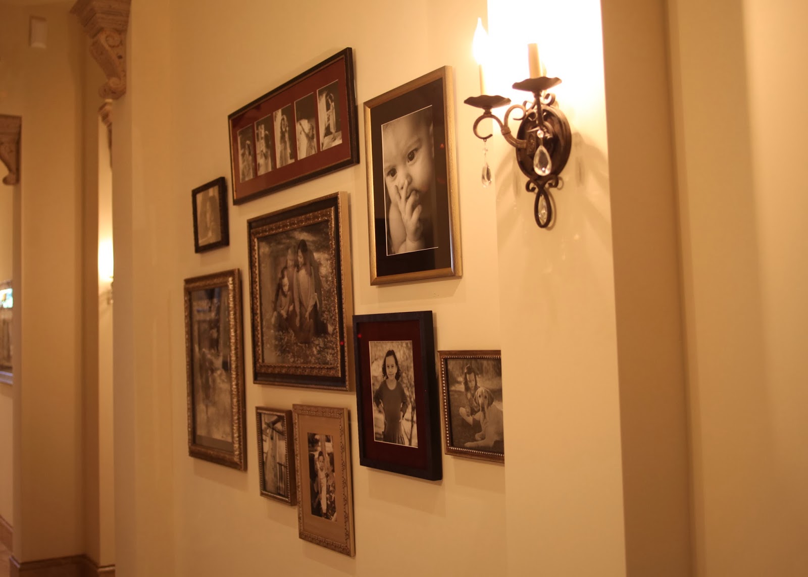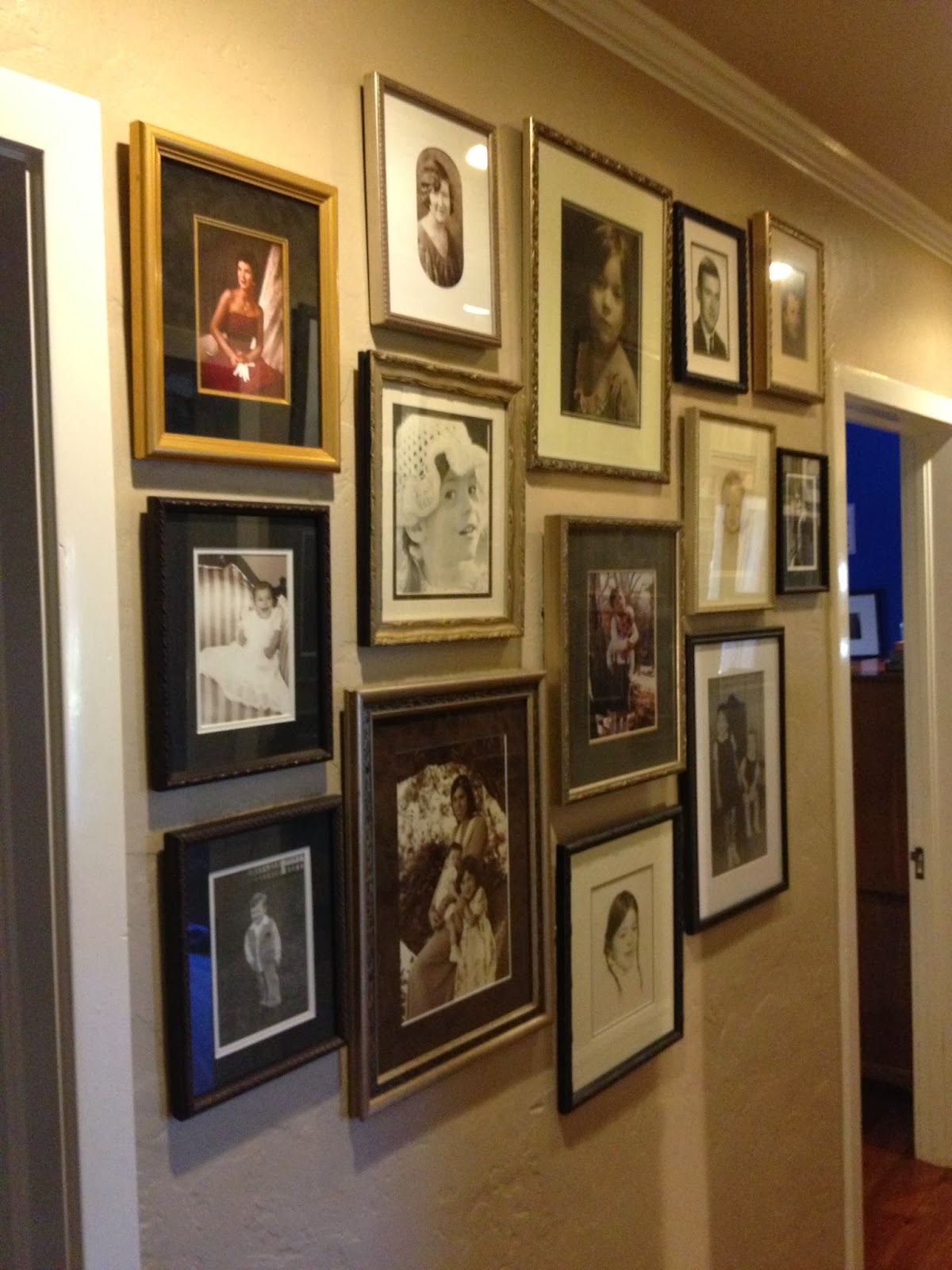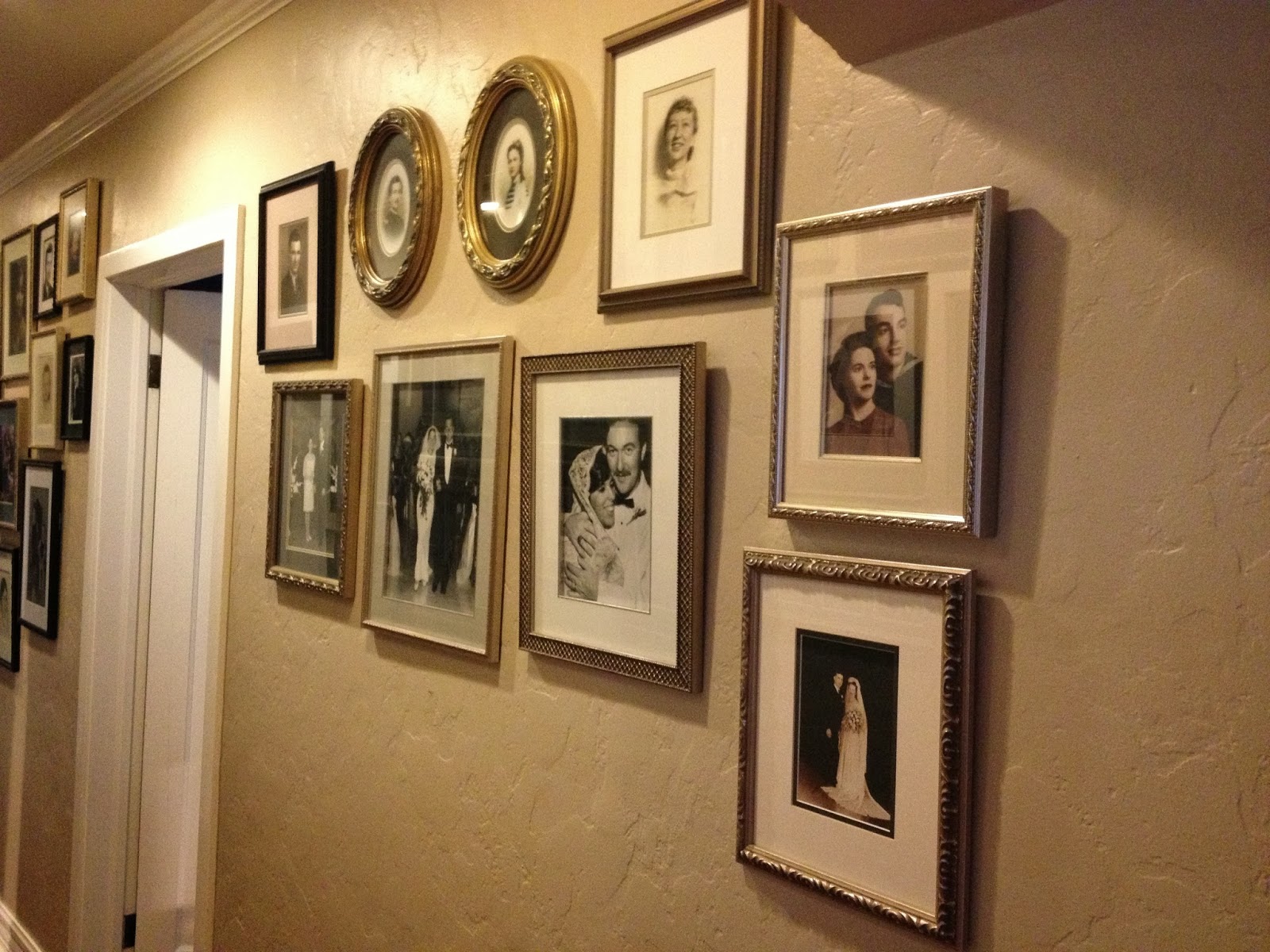 One side of a hallway wall in my home with older photographs of my parents, grandparents, myself and my husband when we were children.