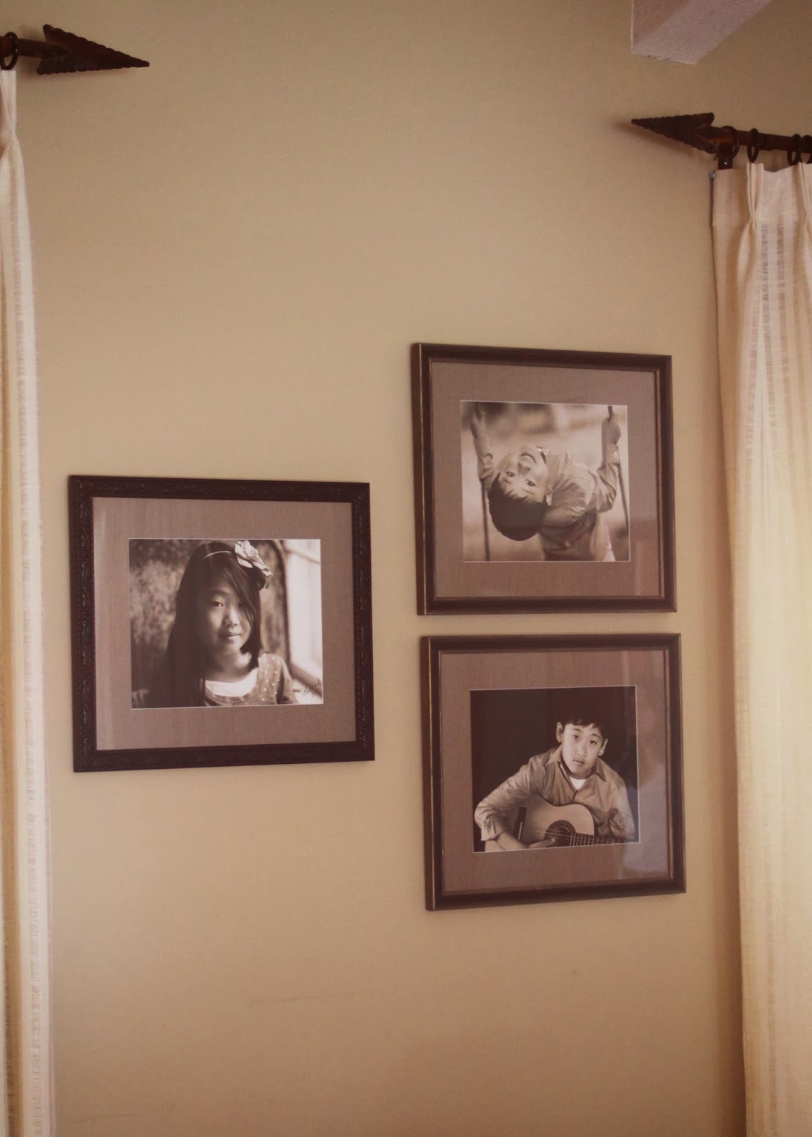 These walls were created over time as the family and children have grown. They can be framed in different but coordinating frames as above, or the same frames as below. They can be in a hallway, family room, or any other area that you and your children see often – because it is for you after all!