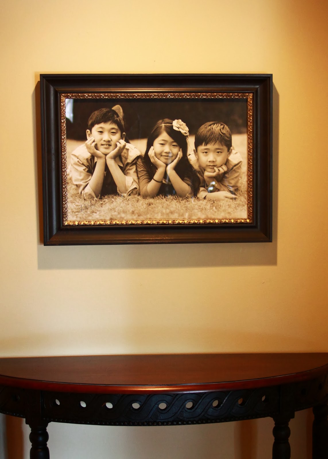 I was lucky because my grandparents put a high value on beautiful photography and saved to be able to have those photographs. During that time, photographs were created in a beautiful way that ensured the image would not fade off the paper and would stand the test of time in both quality and style (the same that we still offer our clients here) But, don’t worry if you don’t have all of these beautiful heirloom photographs! You can always start with what you have now – your beautiful family! Below are some examples of what I have created in my clients’ own homes. You do not have to have a large wall to be able to create a visual legacy – one portrait over a console table or a small grouping in a bathroom can also be very beautiful and enhance the warmth of your home!